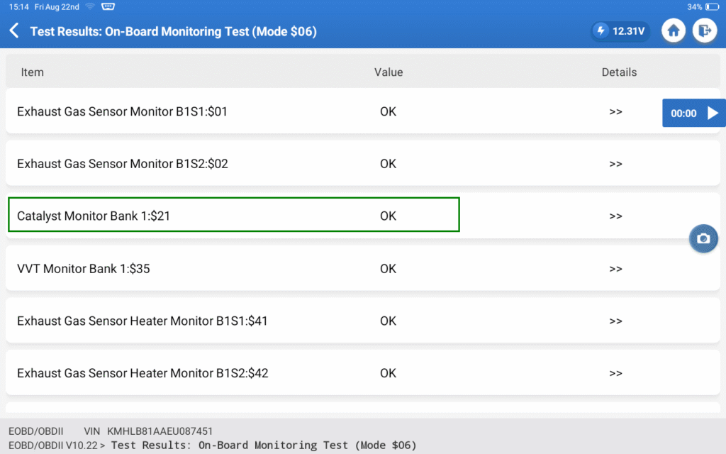 Исправность подтверждена анализом работы датчиков кислорода (O₂ sensor) до и после катализатора.
